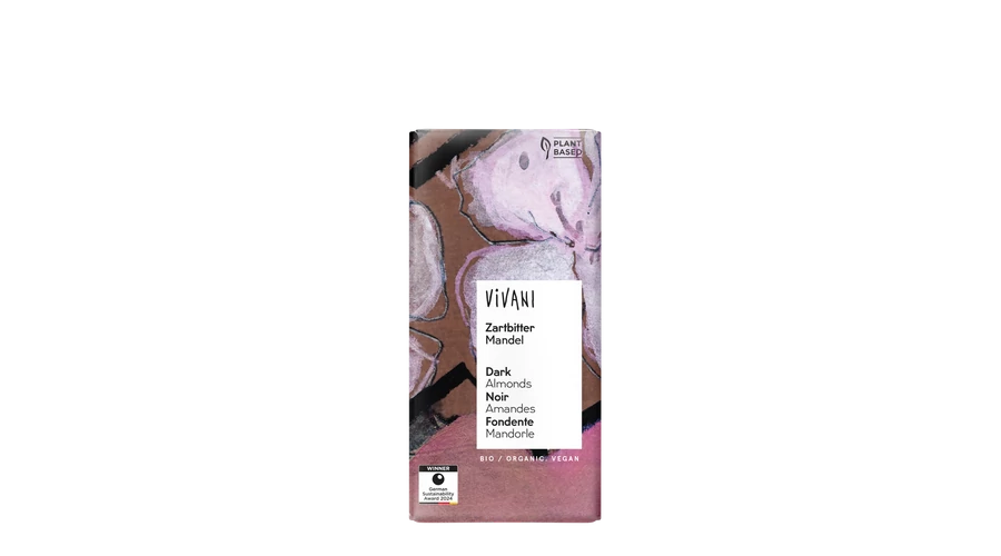 Összetevők: kakaómassza*, nyers nádcukor*,mandula* 20%, kakaóvaj*, mandula őrölve*.