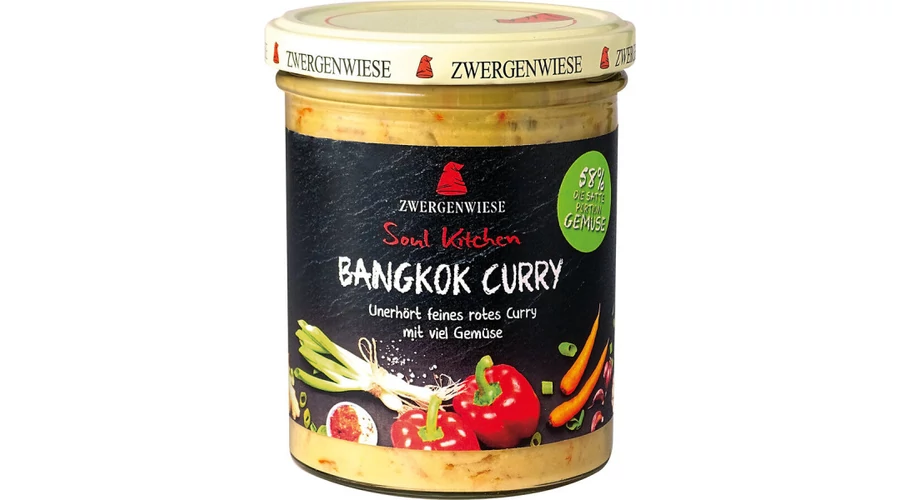 Összetevők: zöldségek* 58% különböző tömegarányban (paprika*, hagyma*, sárgarépa*, zeller*, újhagyma*), víz, kókusztej* 10%, napraforgóolaj*, napraforgómag*, almalé koncentrátum*, burgonyakeményítő*, vörös curry paszta* 1,3% (napraforgóolaj*, vöröshagyma*, chilipaprika*, fokhagyma*, kősó, lime-lé koncentrátum*, kömény*, koriander*, gyömbér*, citrommirtusz*), kősó, lime-lé koncentrátum*, fokhagyma*, gyömbér*, bors*, cayenne bors*.